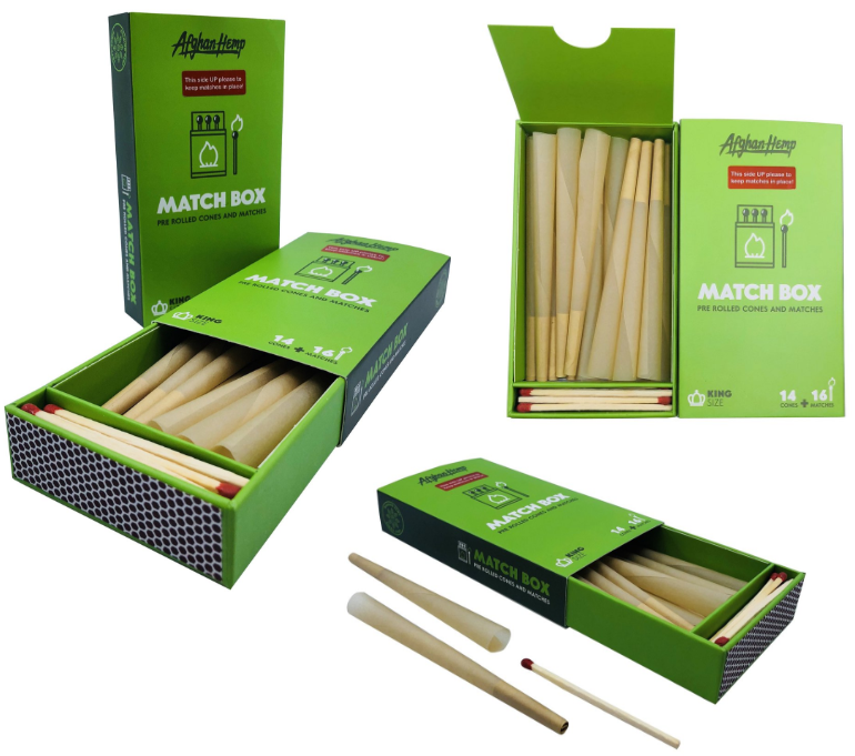 This is the all new Afghan Hemp matchbox, we incorporated matches into this pack of cones so whether you have a lighter or not your prepared. You can also use the matches as a way...
