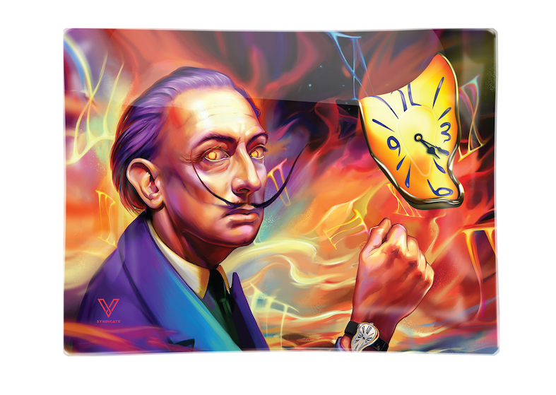 Delirious Salvador Dalí Glass Tray Two sizes: Small (6.5 in. x 5 in.) Inside Box (7.25 in. x 5.5 in.) Medium (10 in. x 6.25 in.) Inside Box (11 in. x 7.5 in.) Made from high quality tempered shatter resistant glass.