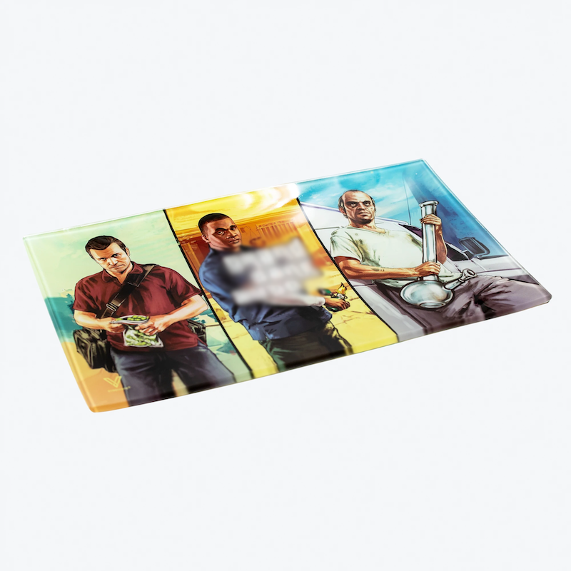 Grand Dank Auto Glass Rolling Tray Two sizes: Small (6.5 in. x 5 in.) Inside Box (7.25 in. x 5.5 in.) Medium (10 in. x 6.25 in.) Inside Box (11 in. x 7.5 in.) Made from high quality tempered shatter resistant glass.